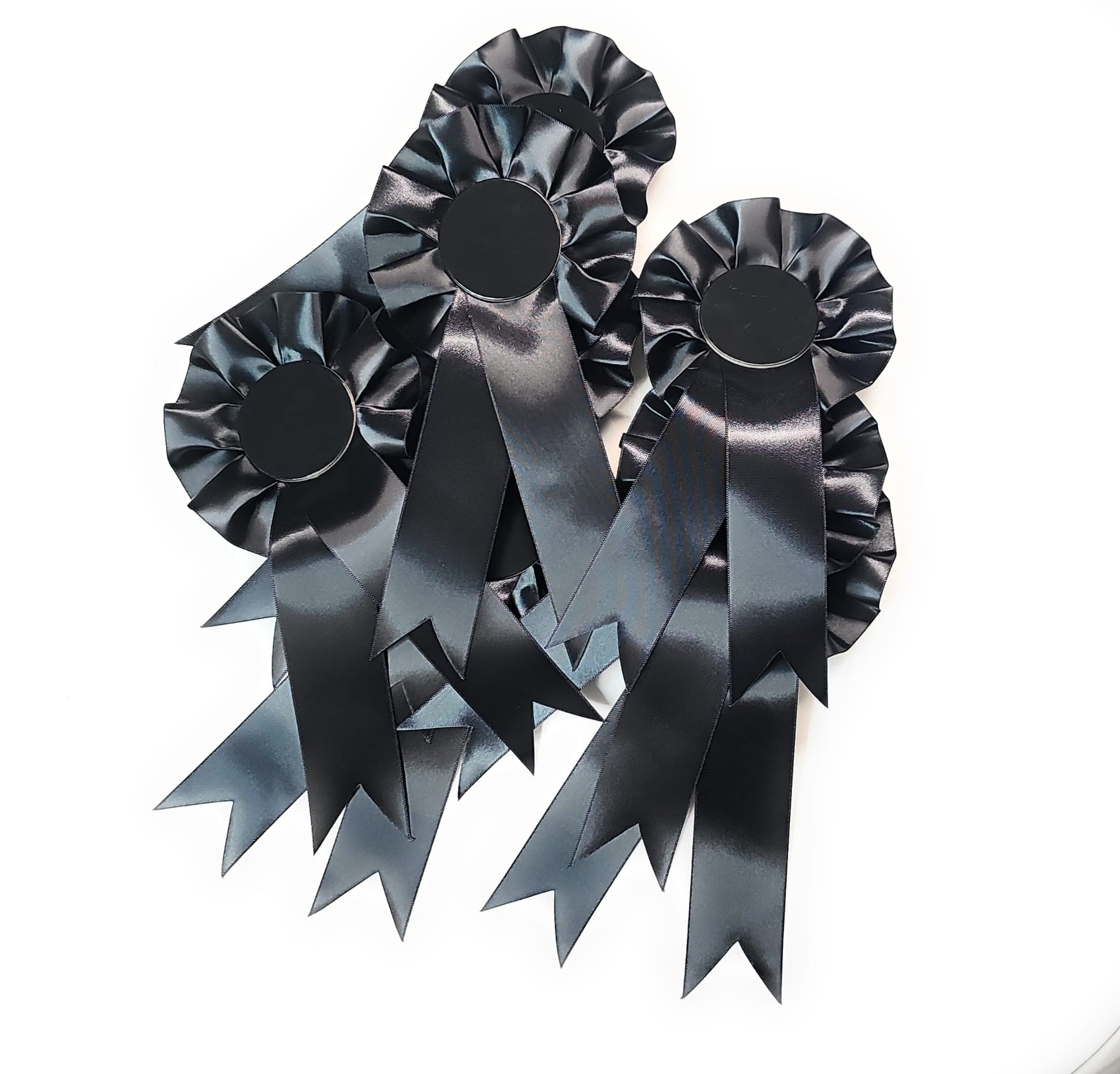 These Rosettes are 1 TIER and are ideal for funerals and elections. With 50mm plain centres and brooch pins used on the back, the Rosettes are about 24cm long (with the tail ribbon).